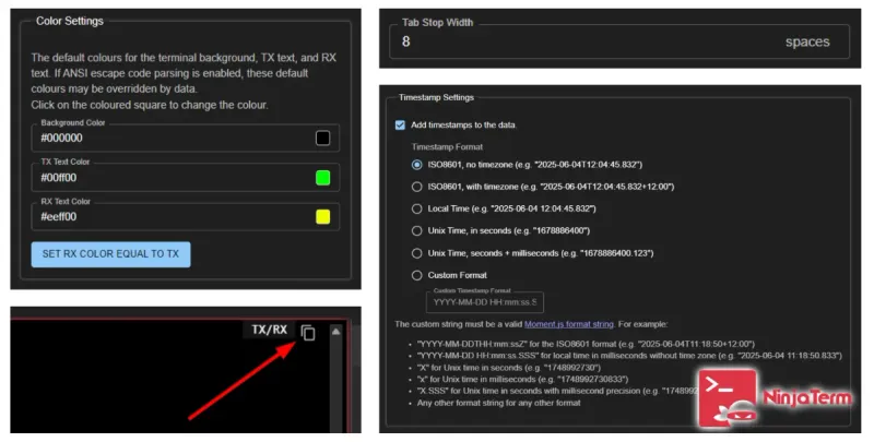 v4.20.0 of NinjaTerm has been released! A bunch of new features have been added such as timestamps, background/text colors and autoscroll lock on TX data.