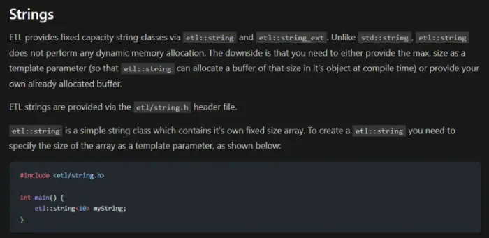 Added info about ETL strings to the C++ on Embedded Systems page.